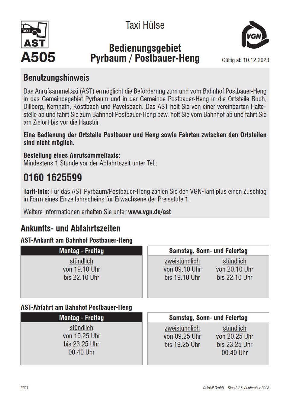 Bereits zum 12.12.2016 wurde für die Gemeindegebiete Postbauer-Heng und Pyrbaum ein Anrufsammeltaxi eingeführt.